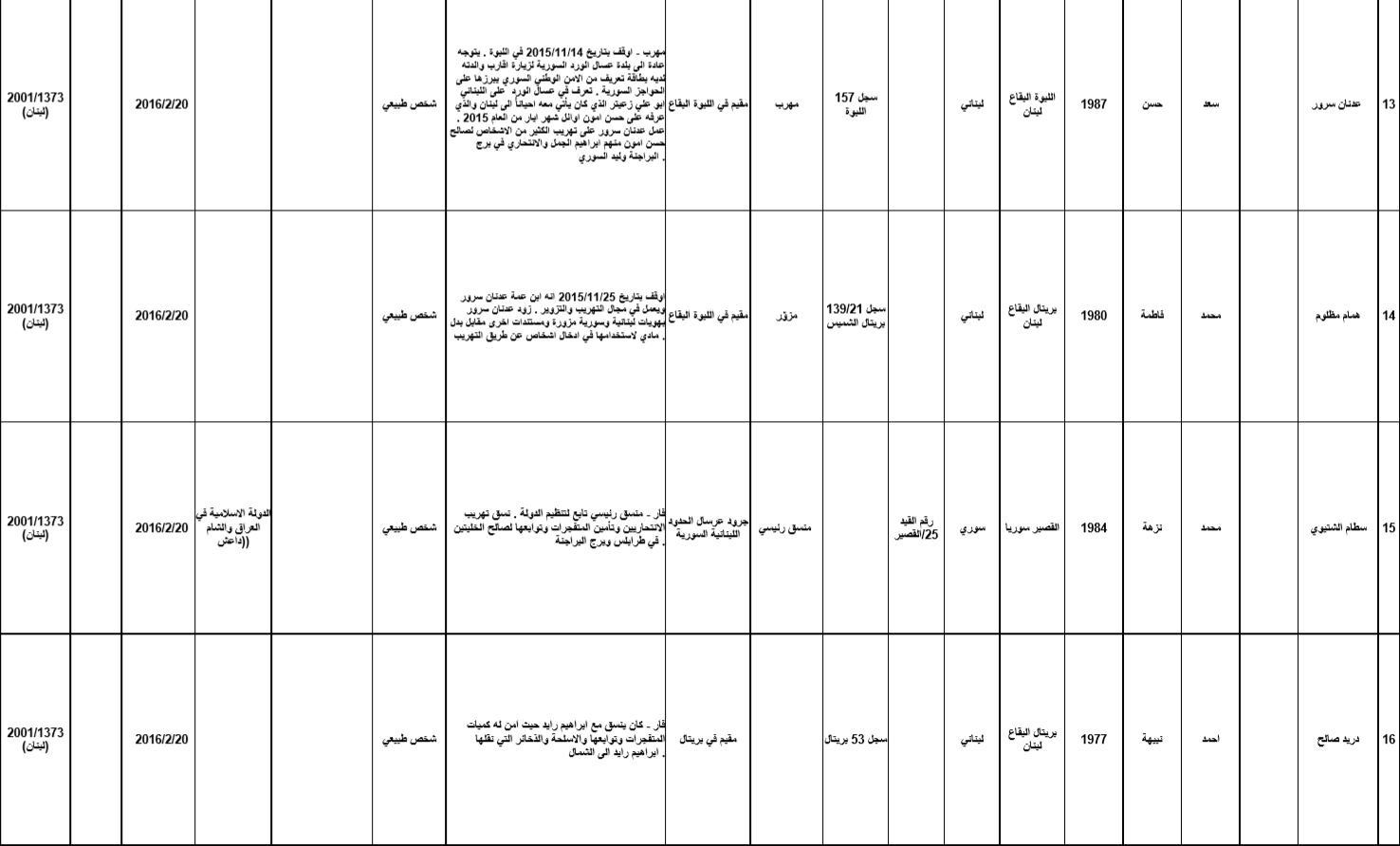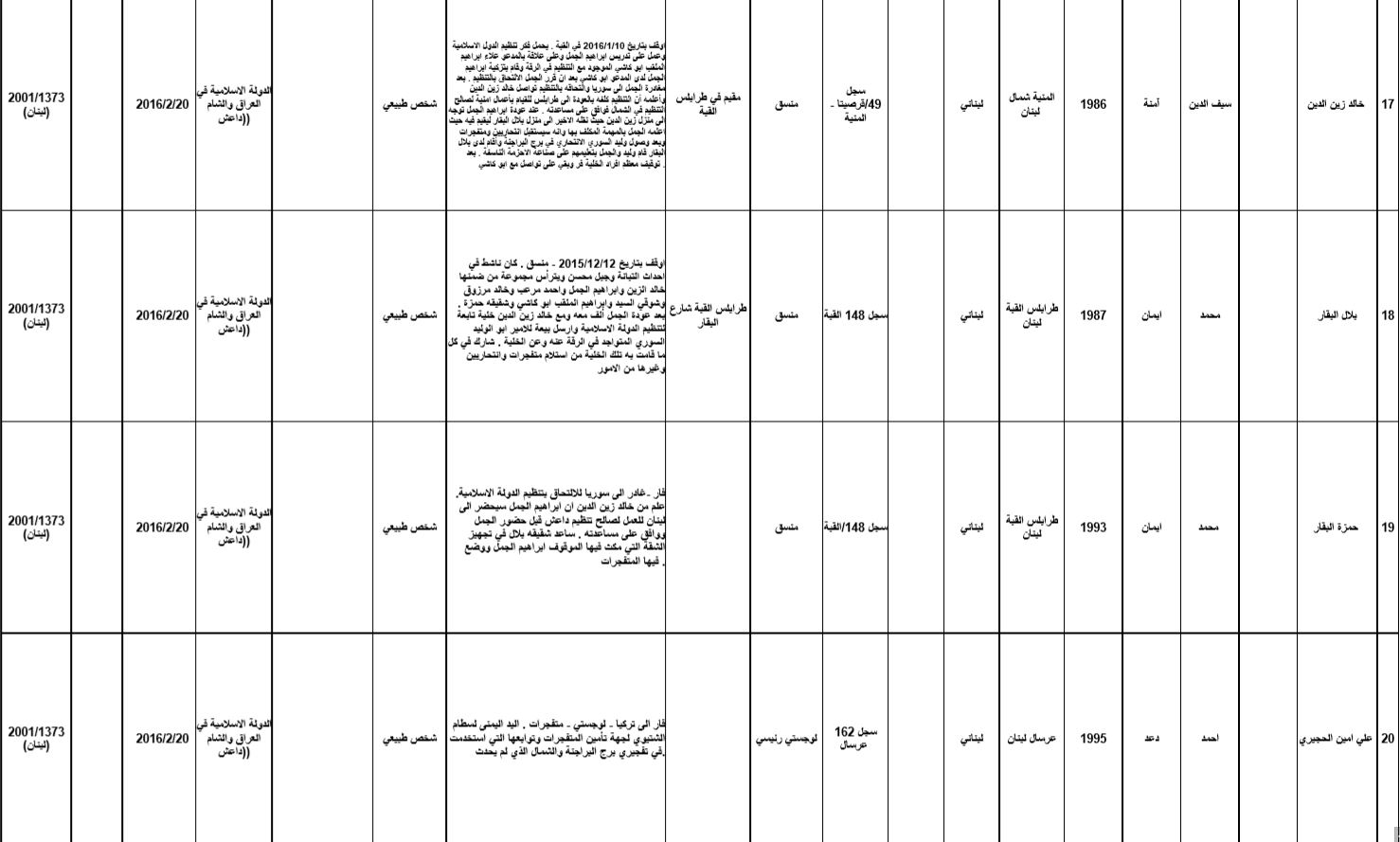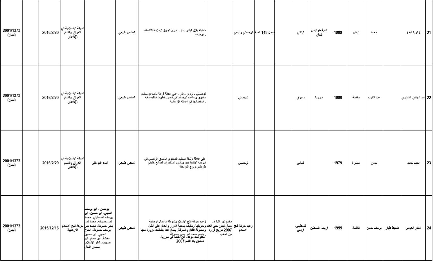 - تحذير: يحظّر على أي شخص توفير أية أموال أو أصول أو خدمات مالية أو خدمات أخرى ذات صلة، بشكل مباشر أو غير مباشر، بالانفراد أو بالاشتراك مع غيرهم، لصالح أي من المدرجين وذلك تحت طائلة الملاحقة القانونية.