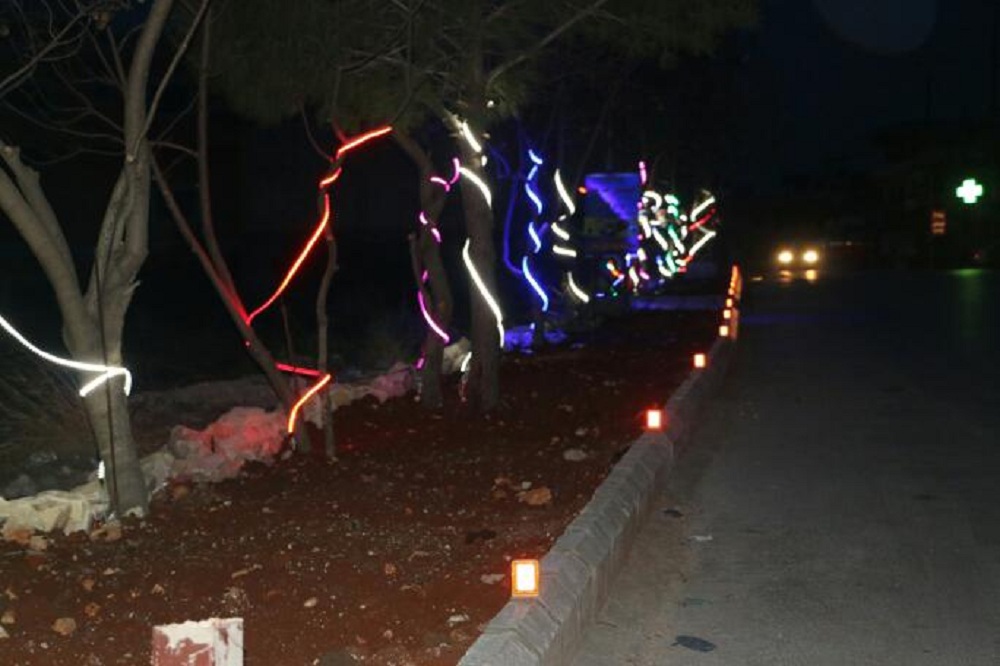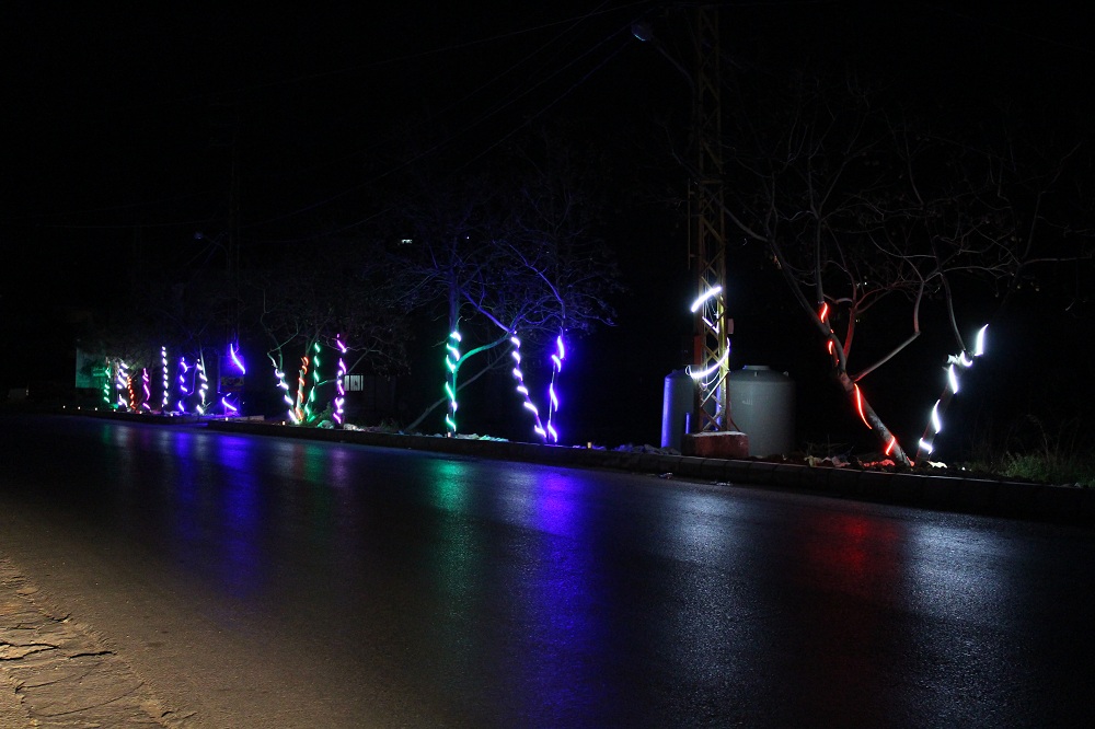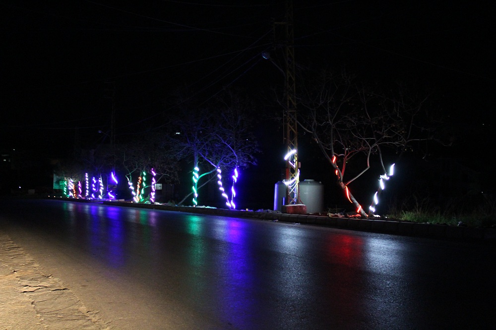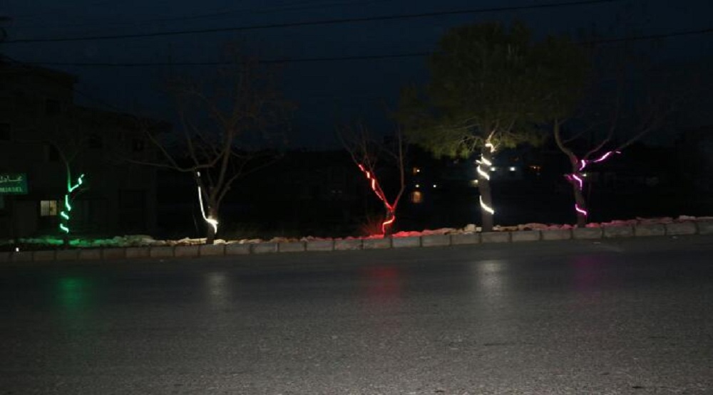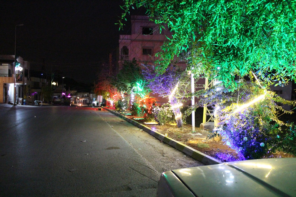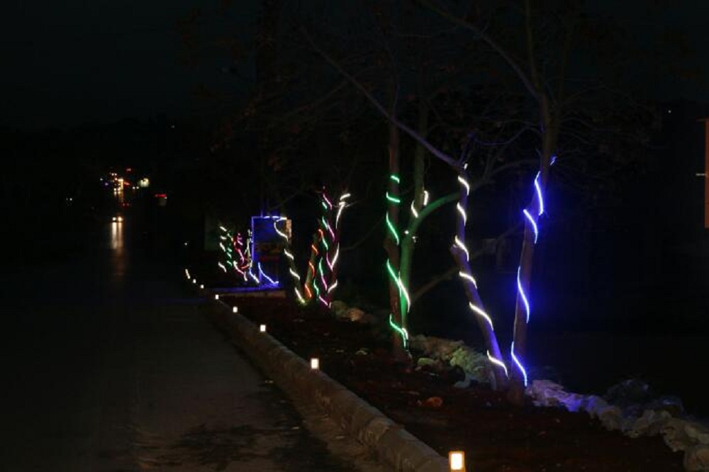 كما نفذت اعمال الانارة الملونة فتمت اضاءة كلمات " علي " على الاعمدة اضافة لانارة المدخل الرئيسي للبلدة